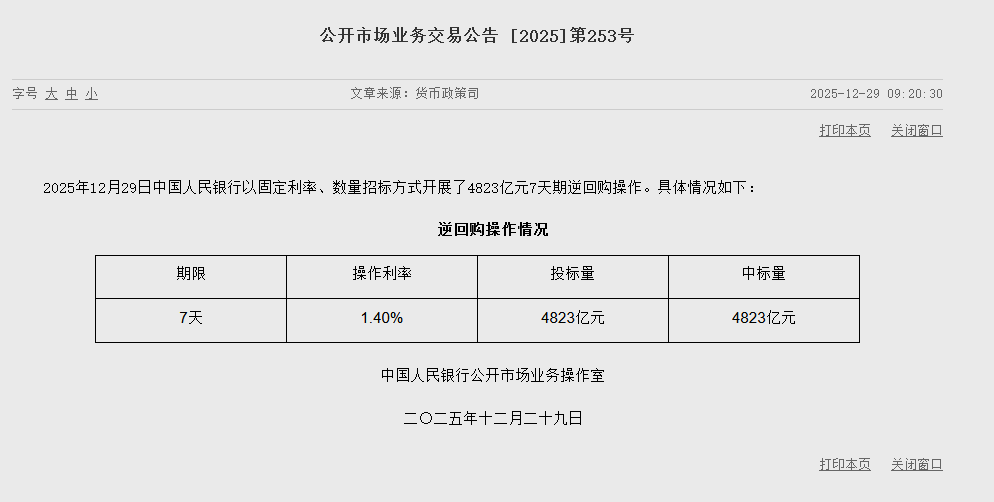 12月29日金融一线消息,据央行官网牛客栈,2025年12月29日中国人民银行以固定利率、数量招标方式开展了4823亿元7天期逆回购操作。